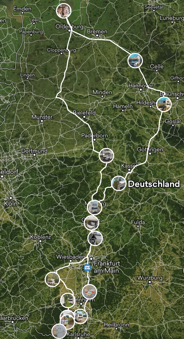 In den Herbstferien wollen wir 2 Wochen über Gießen zur Hessischen Bergstraße um dann weiter in die Pfalz um über die „Nahe-Region“ und den Serengeti-Park zurück nach Hause zu fahren