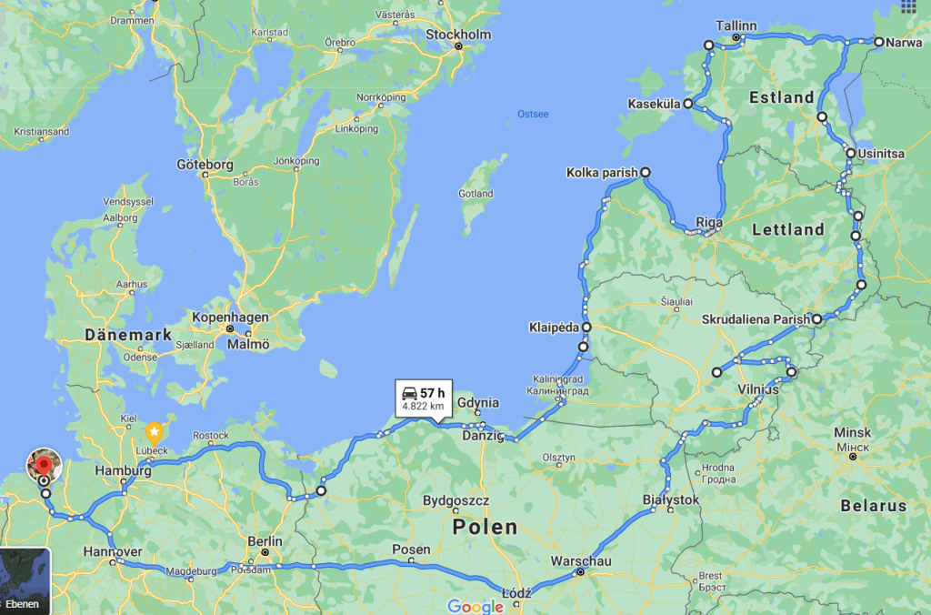 Unsere geplante Reiseroute: Anreise über Polen (Lodz, Warschau), Bialystok. Besuch von Vilnius (eventuell Mittelpunkt Europas), an der Grenze zu Belarus und Russland nach Narwa. An der Ostseeküste zurück über Tallin, Riga, Vendspils, Klaipeda. Falls es bis dahin erlaubt ist fahren wir über die kurische Nehrung und Kaliningrad in die „Dreistadt / Triomiasto“ (Danzig/Gydnia/Sopot) und über Stettin und Usedom zurück. (geplant: ca. 5000km)