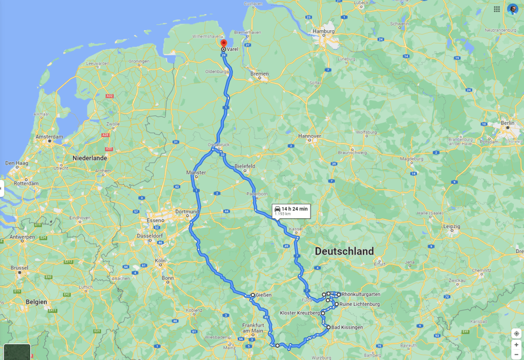 Unsere geplante Reiseroute: Reise über Gießen (Besuch bei Familie), Aschaffenburg, Bad Kissingen (Abenteuer Allrad), verschiedene „Stationen“ in der Rhön, Kassel und retour.